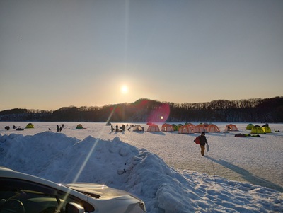 今年も早々にホームグラウンドを視察しようと久しぶりに氷点下を脱出した日中を鑑み、妻と一緒に今日も「道の市」経由でドライブライブを企てるのであるが、予想通り道路には雪はないものの、べちゃべちゃのプチ洪水状態。車も泥まみれで、どこを走って来たのかと思う位、汚れまくるのであるが、これも毎年のことで気にしていたら埒が明かない。無事に「道の市」に到着すると何と鮮魚売り場のシャッターが閉じている。どうやら、海が凍っていて漁はもうおしまい、3月までは冷凍ものしか置いていないということであった。まあ、そんな中でもスケドウダラの卵が生で400g(約6匹分)と380円と格安で売っていたので、2パック購入し、タラコにでもしてみようと思いを巡らせ、ズワイも安く買いたかったのだが、そんなに食いきれないだろうし、此処は断念。予てから気になっていた、スーパーAG呂、何て読むのだろうかっと調べてみると、どうやら「えいじろう」らしい。売っている魚介類は道の市と同じようなものだが、生食用の蠣、たちなども安く売っていたので、どうしようかと迷った挙句、まずは第一ホームグランドを視察することにした。漁港に到着すると、流石に釣り人ナシ、生体反応ナシっというか、「道の市」の店員の言ったっ通り、海が凍っている。今日は暖かいので少しは解けたのだろうが、早朝にはびっしり氷で埋め尽くされていると思うので、流石に漁に出るのは無理なのであろう。今日はクーラーに氷を入れてくるのを忘れたため、生蠣の購入を思案していたのだが、雪を入れればいいのか~っと思い、漁港で天然保冷剤をゲット、再びAG呂に戻り、生蠣、たちを購入し、第二ホームへと向かうのであった。網走の道の駅では、いつもと雰囲気が違うな~っと思いきや流氷に備えてか、遊覧船乗り場が設置されており、此処から船が出るのか~っと、昔、紋別からカレイ釣りに出掛けた記憶が頭を過る。そして肝心な第二、第三ホームであるが、第二では釣り人3名がこの時期なのに未だアキアジを狙っていたのだが、まあ、休日の時間潰しと言ったところであろう。いつもは人で一杯の第三ホームは釣り人ナシで、雪も積もっており、車が入った跡すらないので、もう釣れないのであろう。っということで、ファイヤーバーグで昼食を頂いた後は、網走湖のワカサギ釣りを視察することにした。第2駐車場もほぼ満車の状態で、人で賑わっていたが、以外にも年齢層が低く、大学生位のメンバーや若いカップル、家族連れが目立つ。もちろん猛者級のオイヤン達も自分のドリル持参で釣りに集中していたのだが、意外にも爆釣モードで短時間で100匹以上は釣り上げていたのではないだろうか、天ぷらセットというものもあるようで、釣りたてのワカサギをその場で天ぷらにして食べている家族も多く、調理場も人で賑わっていた。セットで一人2200円、テントが2000円なので、まあ、丸一日遊んで一人5000円と言うところだろうか、ワカサギのお土産付きなのだから、楽しい時間を過ごすには良いのだが、氷上なので底冷えするから寒さ対策は万全を喫した方が良い。1月5日から2月11日までの短期間の釣りなので、1回は挑戦してみたいところである。