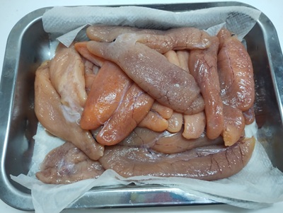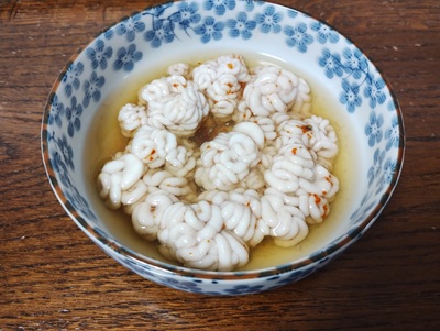 戦利品の生タラコは、塩漬け、たちは湯引き、蠣はポン酢で頂き、今日も海産物満載でお腹を満たすのであった。生タラコは、塩水で洗った後に、塩をタップリ塗して1晩冷蔵庫で寝かせて、翌朝に1%塩水で塩抜きを3時間、その後は水で洗って、水を切り、冷蔵庫で1晩、乾燥させる。正にお店に売っている状態、そのもので意外にも簡単にできてしまう。最初に洗うのを料理酒にしておくと臭みも取れる。あとはお好みで昆布出汁、食紅などを加えれば、綺麗な仕上がり、上品な味付けとなるのだろうが、今回は、大幅に手を抜き、食紅ナシ、昆布出汁と料理酒は塩抜き時に少し入れてみた。約800円で、24本のタラコができてしまうのだから、ちょっと商売をしたくなってくる。次回は辛子明太子にも挑戦してみよう。